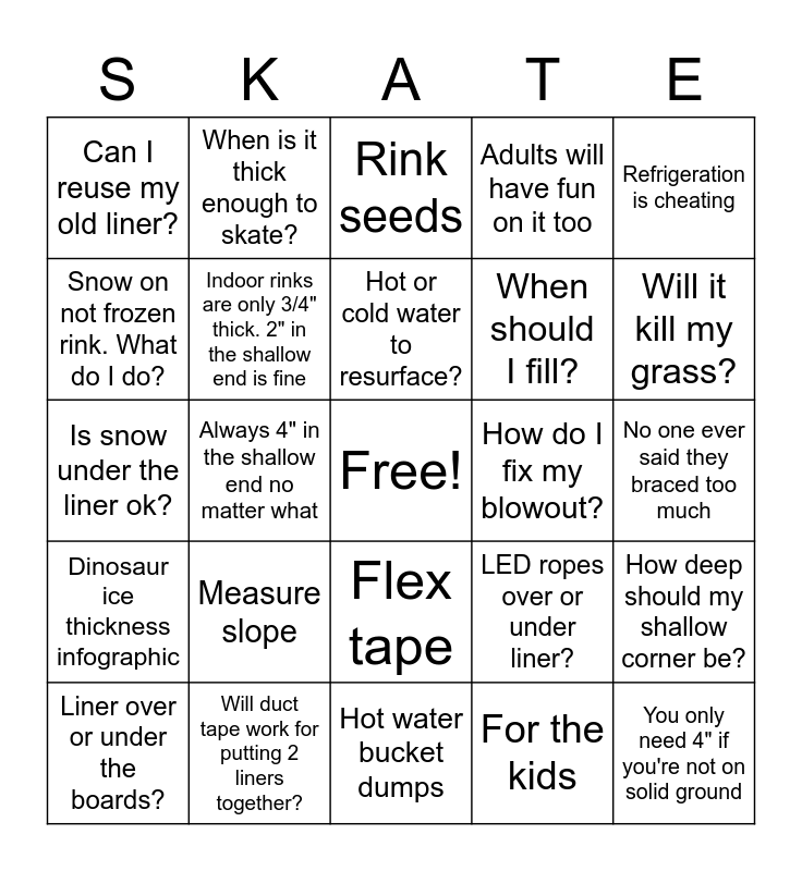 This bingo card has a free space and 24 words: Measure slope, Will duct tape work for putting 2 liners together?, Hot or cold water to resurface?, Liner over or under the boards?, Refrigeration is cheating, Can I reuse my old liner?, Snow on not frozen rink. What do I do?, When is it thick enough to skate?, How do I fix my blowout?, Flex tape, When should I fill?, Is snow under the liner ok?, LED ropes over or under liner?, How deep should my shallow corner be?, Indoor rinks are only 3/4" thick. 2" in the shallow end is fine, For the kids, No one ever said they braced too much, Rink seeds, Will it kill my grass?, Always 4" in the shallow end no matter what, You only need 4" if you're not on solid ground, Dinosaur ice thickness infographic, Adults will have fun on it too and Hot water bucket dumps.