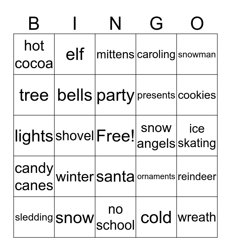 This bingo card has a free space and 24 words: winter, snow, party, sledding, snowman, hot cocoa, tree, elf, snow angels, santa, presents, lights, ornaments, reindeer, bells, cold, ice skating, mittens, cookies, shovel, wreath, candy canes, caroling and no school.