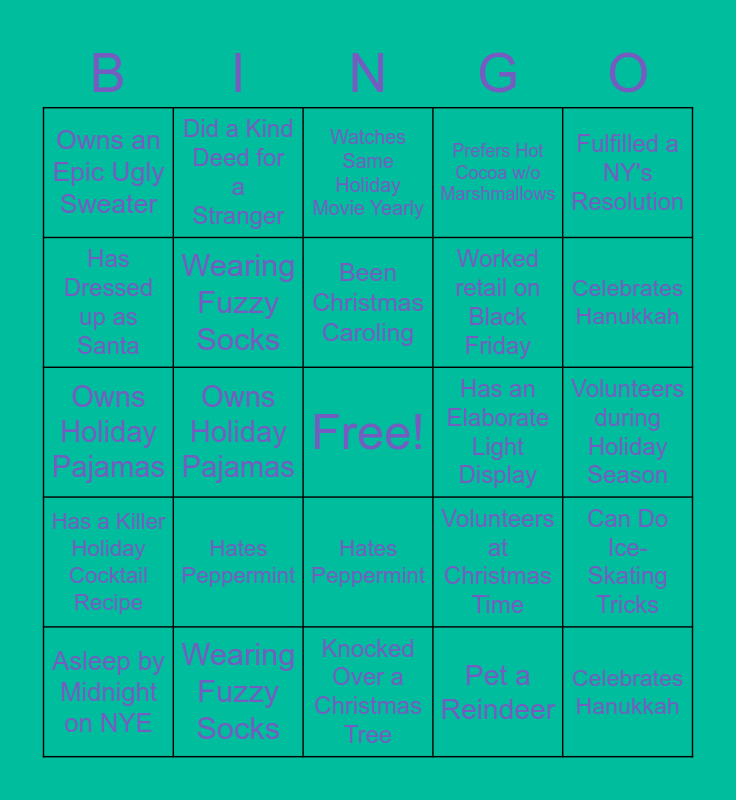 ⚠ This card has duplicate items: Has a Working Fireplace (2), Celebrates Hanukkah (2), Asleep by Midnight on NYE (2), Knocked Over a Christmas Tree (2), Hates Peppermint (2), Has a Killer Holiday Cocktail Recipe (2), Did a Kind Deed for a Stranger (2), Prefers Mittens to Gloves (2), Has Dressed up as Santa (2), Hand-makes holiday presents (2), Wearing Fuzzy Socks (2), Prefers Hot Cocoa w/o Marshmallows (2), Can Do Ice-Skating Tricks (2), Witnessed a Real-Life Holiday Proposal (2), Has an Elaborate Light Display (2), Watches Same Holiday Movie Yearly (2), Fulfilled a NY's Resolution (2), Owns Holiday Pajamas (2), Pet a Reindeer (2), Owns an Epic Ugly Sweater (2), Worked retail on Black Friday (2)