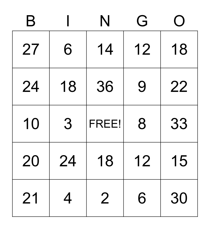 This bingo card has a free space and 24 words: 24, 4, 36, 21, 18, 27, 24, 6, 8, 18, 9, 10, 12, 15, 18, 6, 33, 14, 22, 3, 30, 20, 12 and 2.