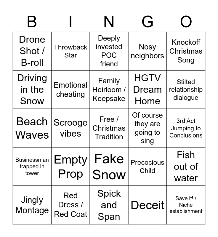 This bingo card has a free space and 24 words: Empty Prop, Red Dress / Red Coat, Family Heirloom / Keepsake, Jingly Montage, Knockoff Christmas Song, Drone Shot / B-roll, Driving in the Snow, Throwback Star, Of course they are going to sing, Fake Snow, HGTV Dream Home, Beach Waves, Precocious Child, Fish out of water, Emotional cheating, Deceit, 3rd Act Jumping to Conclusions, Deeply invested POC friend, Stilted relationship dialogue, Scrooge vibes, Save it! / Niche establishment, Businessman trapped in tower, Nosy neighbors and Spick and Span.