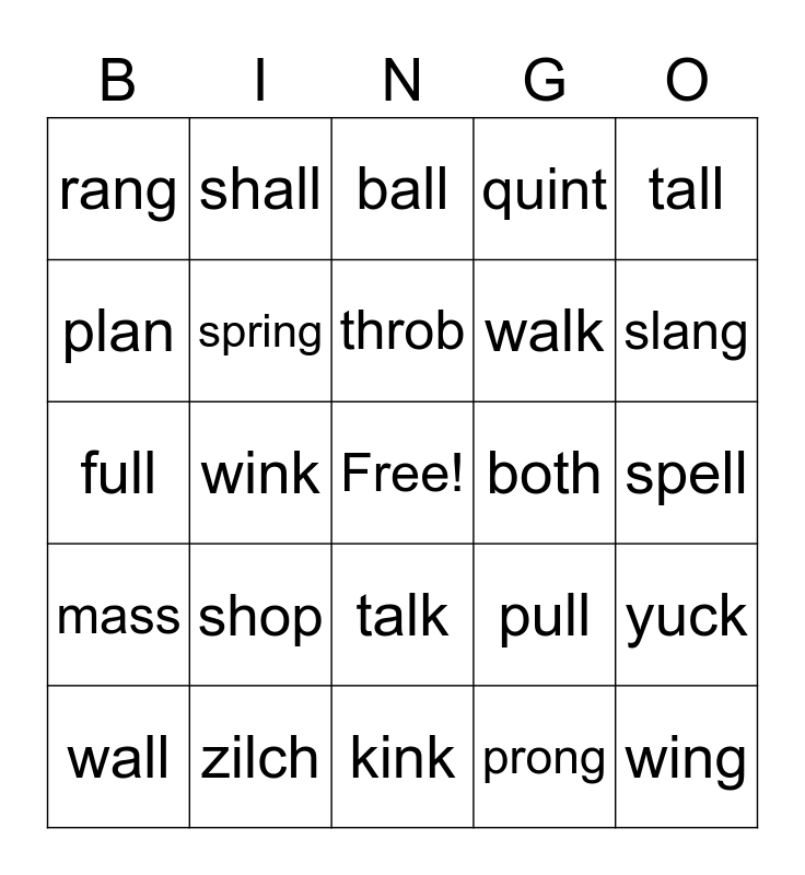 This bingo card has a free space and 24 words: shop, zilch, throb, wall, tall, rang, plan, shall, both, talk, walk, full, pull, yuck, spring, prong, spell, ball, slang, wink, wing, mass, quint and kink.