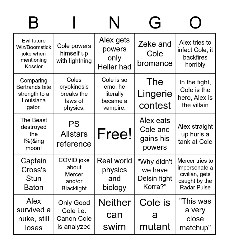 This bingo card has a free space and 24 words: COVID joke about Mercer and/or Blacklight, Only Good Cole i.e. Canon Cole is analyzed, Cole is so emo, he literally became a vampire., Alex survived a nuke, still loses, Alex tries to infect Cole, it backfires horribly, Evil future Wiz/Boomstick joke when mentioning Kessler, Comparing Bertrands bite strength to a Louisiana gator., Cole powers himself up with lightning, Alex eats Cole and gains his powers, Real world physics and biology, The Lingerie contest, The Beast destroyed the f%(&ing moon!, "Why didn't we have Delsin fight Korra?", Mercer tries to impersonate a civilian, gets caught by the Radar Pulse, Coles cryokinesis breaks the laws of physics., Cole is a mutant, Alex straight up hurls a tank at Cole, Alex gets powers only Heller had, In the fight, Cole is the hero, Alex is the villain, PS Allstars reference, "This was a very close matchup", Captain Cross's Stun Baton, Zeke and Cole bromance and Neither can swim.