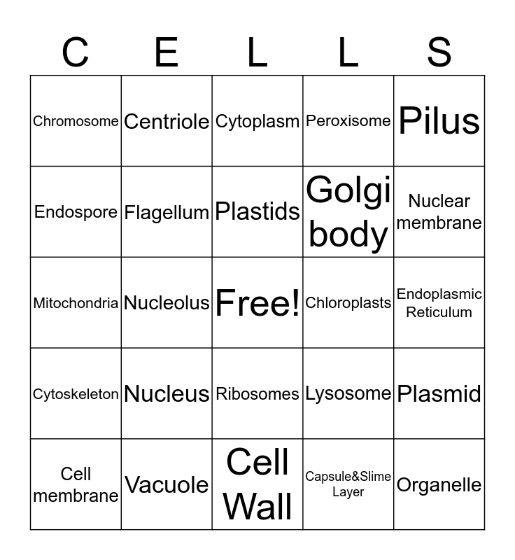 This bingo card has a free space and 24 words: Nucleus, Vacuole, Plastids, Cell membrane, Pilus, Chromosome, Endospore, Centriole, Chloroplasts, Ribosomes, Golgi body, Mitochondria, Lysosome, Plasmid, Flagellum, Capsule&Slime Layer, Endoplasmic Reticulum, Cytoplasm, Nuclear membrane, Nucleolus, Organelle, Cytoskeleton, Peroxisome and Cell Wall.
