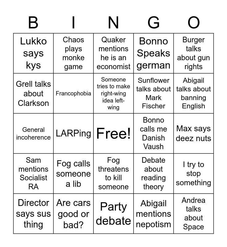 This bingo card has a free space and 25 words: Fog calls someone a lib, Party debate, Someone tries to make right-wing idea left-wing, Director says sus thing, Burger talks about gun rights, Lukko says kys, Grell talks about Clarkson, Chaos plays monke game, Bonno calls me Danish Vaush, Fog threatens to kill someone, Sunflower talks about Mark Fischer, General incoherence, Debate about reading theory, I try to stop something, Francophobia, If market socialism is socialism, Max says deez nuts, Quaker mentions he is an economist, Abigail talks about banning English, LARPing, Andrea talks about Space, Are cars good or bad?, Sam mentions Socialist RA, Bonno Speaks german and Abigail mentions nepotism.