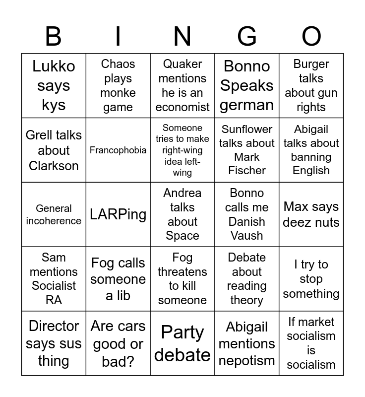 This bingo card has 25 words: Fog calls someone a lib, Party debate, Someone tries to make right-wing idea left-wing, Director says sus thing, Burger talks about gun rights, Lukko says kys, Grell talks about Clarkson, Chaos plays monke game, Bonno calls me Danish Vaush, Fog threatens to kill someone, Sunflower talks about Mark Fischer, General incoherence, Debate about reading theory, I try to stop something, Francophobia, If market socialism is socialism, Max says deez nuts, Quaker mentions he is an economist, Abigail talks about banning English, LARPing, Andrea talks about Space, Are cars good or bad?, Sam mentions Socialist RA, Bonno Speaks german and Abigail mentions nepotism.