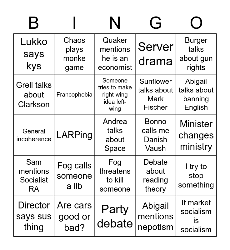 This bingo card has 25 words: Fog calls someone a lib, Party debate, Someone tries to make right-wing idea left-wing, Director says sus thing, Burger talks about gun rights, Lukko says kys, Grell talks about Clarkson, Chaos plays monke game, Bonno calls me Danish Vaush, Fog threatens to kill someone, Sunflower talks about Mark Fischer, General incoherence, Debate about reading theory, I try to stop something, Francophobia, If market socialism is socialism, Minister changes ministry, Quaker mentions he is an economist, Abigail talks about banning English, LARPing, Andrea talks about Space, Are cars good or bad?, Sam mentions Socialist RA, Server drama and Abigail mentions nepotism.