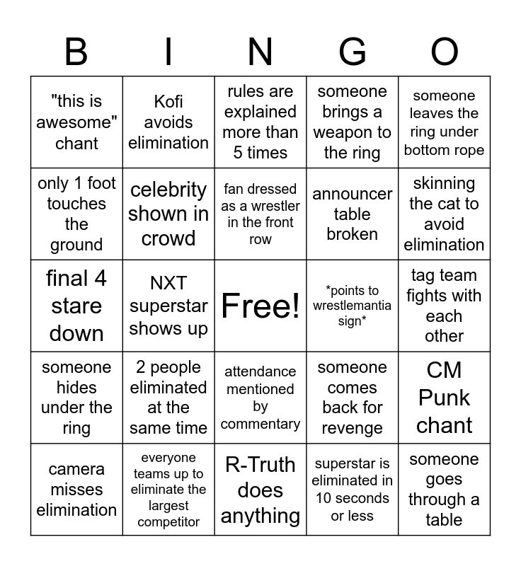 This bingo card has a free space and 24 words: 2 people eliminated at the same time, everyone teams up to eliminate the largest competitor, fan dressed as a wrestler in the front row, camera misses elimination, someone leaves the ring under bottom rope, "this is awesome" chant, only 1 foot touches the ground, Kofi avoids elimination, *points to wrestlemantia sign*, attendance mentioned by commentary, announcer table broken, final 4 stare down, someone comes back for revenge, CM Punk chant, celebrity shown in crowd, superstar is eliminated in 10 seconds or less, tag team fights with each other, rules are explained more than 5 times, skinning the cat to avoid elimination, NXT superstar shows up, someone goes through a table, someone hides under the ring, someone brings a weapon to the ring and R-Truth does anything.