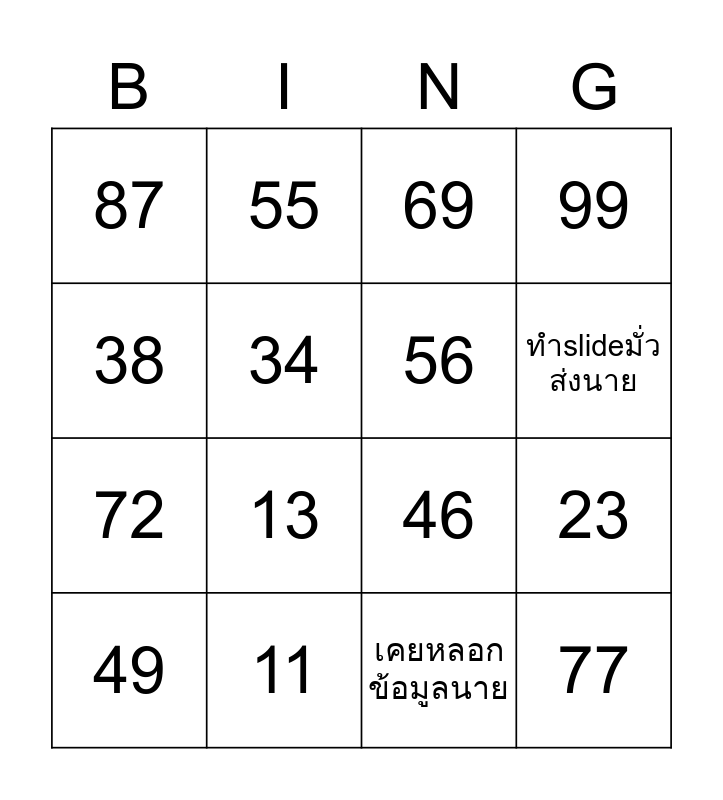 This bingo card has 16 words: 11, 23, 69, 87, 72, 55, 46, เคยหลอกข้อมูลนาย, 38, 34, 49, 99, 13, ทำslideมั่วส่งนาย, 56 and 77.