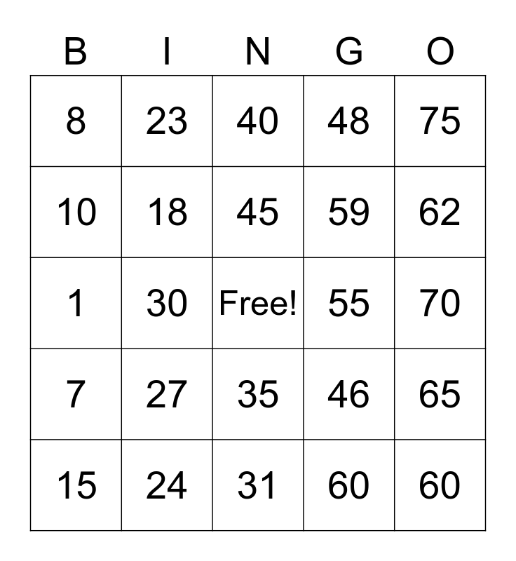 This bingo card has a free space and 24 words: 15, 27, 45, 60, 75, 8, 23, 40, 55, 70, 1, 18, 46, 65, 10, 24, 31, 48, 62, 7, 30, 35, 59 and 60.