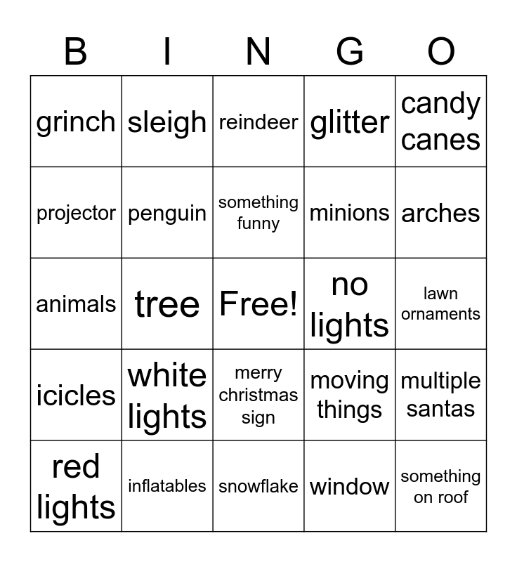 This bingo card has a free space and 29 words: red lights, blue lights, tree, santa, grinch, reindeer, penguin, white lights, no lights, inflatables, lawn ornaments, something on roof, snowflake, window, arches, ornaments, merry christmas sign, icicles, candy canes, animals, moving things, yoda, minions, projector, glitter, sleigh, multiple santas, something funny and etc.