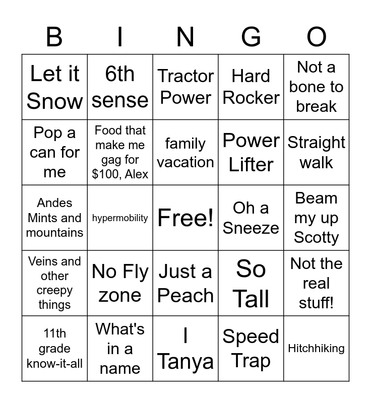 This bingo card has a free space and 24 words: No Fly zone, What's in a name, family vacation, 11th grade know-it-all, Not a bone to break, Let it Snow, Pop a can for me, 6th sense, Oh a Sneeze, Just a Peach, Power Lifter, Andes Mints and mountains, So Tall, Not the real stuff!, Food that make me gag for $100, Alex, Speed Trap, Beam my up Scotty, Tractor Power, Straight walk, hypermobility, Hitchhiking, Veins and other creepy things, Hard Rocker and I Tanya.