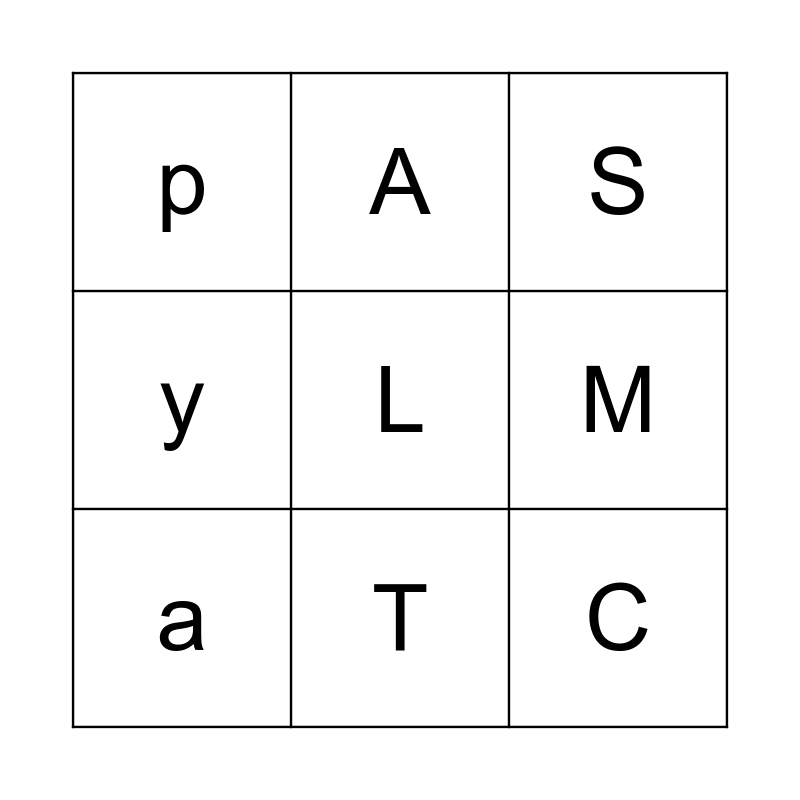 This bingo card has a free space and 8 words: M, S, A, a, p, C, y and T.