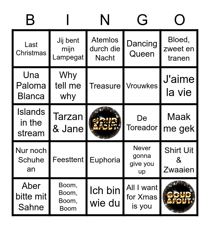 This bingo card has 2 images, a free space and 41 words: 99 luftballons, Aber bitte mit Sahne, Ademnood, All I want for Xmas is you, Atemlos durch die Nacht, Bieber van de Kroeg, Bloed, zweet en tranen, Boom, Boom, Boom, Boom, Dancing Queen, De Toreador, Euphoria, Feesttent, Gold, Ich bin wie du, Ik ga zwemmen, Islands in the stream, I've had the time of my life, J'aime la vie, Jij bent mijn Lampegat, Jij krijgt die lacht niet van mijn gezicht, Kali, Last Christmas, Leef, Maak me gek, Malle Babbe, Mexico, Never gonna give you up, Nur noch Schuhe an, Sexy als ik dans, Shirt Uit & Zwaaien, Sweet Caroline, Tarzan & Jane, Think, Thunderstruck, Toppertje!, Treasure, Una Paloma Blanca, Vrouwkes, Wa'n lekker ding bende gij, Why tell me why and YMCA.