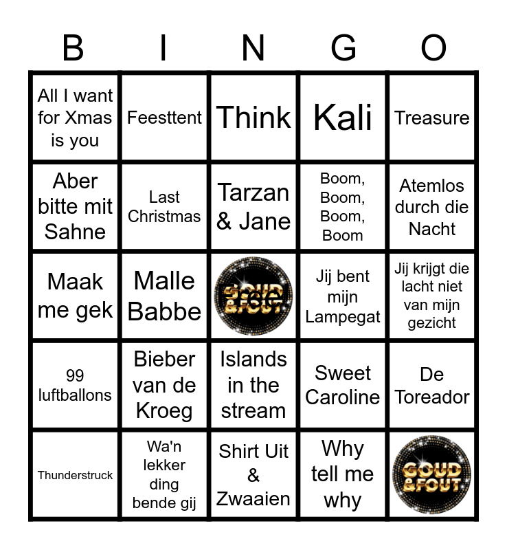 This bingo card has 2 images, a free space and 41 words: Dancing Queen, Thunderstruck, Bloed, zweet en tranen, Why tell me why, Think, I've had the time of my life, Treasure, Wa'n lekker ding bende gij, Kali, Jij bent mijn Lampegat, Islands in the stream, Bieber van de Kroeg, Leef, Shirt Uit & Zwaaien, Una Paloma Blanca, Maak me gek, Toppertje!, Atemlos durch die Nacht, Feesttent, Ademnood, Euphoria, All I want for Xmas is you, Ich bin wie du, Jij krijgt die lacht niet van mijn gezicht, Ik ga zwemmen, Nur noch Schuhe an, Sweet Caroline, 99 luftballons, Sexy als ik dans, De Toreador, Never gonna give you up, Malle Babbe, J'aime la vie, Vrouwkes, Gold, Tarzan & Jane, Aber bitte mit Sahne, Boom, Boom, Boom, Boom, YMCA, Last Christmas and Mexico.