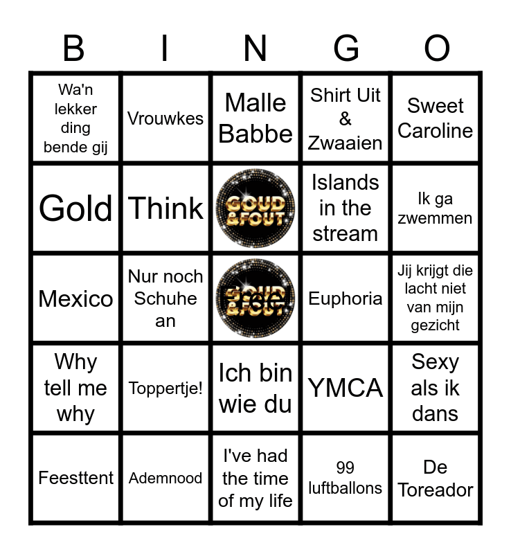 This bingo card has 2 images, a free space and 40 words: Maak me gek, Toppertje!, 99 luftballons, Sexy als ik dans, De Toreador, Never gonna give you up, Malle Babbe, Ich bin wie du, Jij krijgt die lacht niet van mijn gezicht, Ik ga zwemmen, Nur noch Schuhe an, Sweet Caroline, Boom, Boom, Boom, Boom, YMCA, Last Christmas, Mexico, J'aime la vie, Vrouwkes, Gold, Tarzan & Jane, Aber bitte mit Sahne, Wa'n lekker ding bende gij, Kali, Jij bent mijn Lampegat, Islands in the stream, Bieber van de Kroeg, Dancing Queen, Thunderstruck, Bloed, zweet en tranen, Why tell me why, Think, I've had the time of my life, Atemlos durch die Nacht, Feesttent, Ademnood, Euphoria, All I want for Xmas is you, Leef, Shirt Uit & Zwaaien and Una Paloma Blanca.