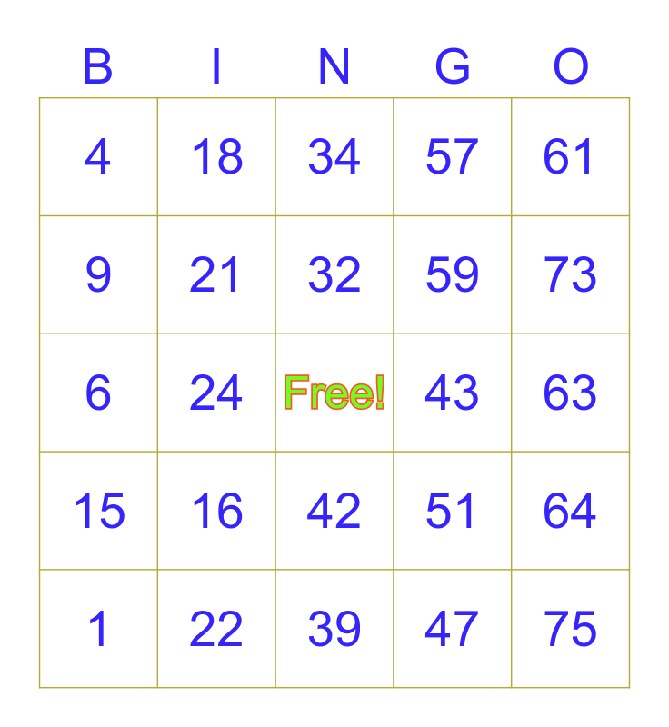 This bingo card has a free space and 24 words: 1, 16, 32, 47, 61, 4, 18, 34, 43, 63, 6, 21, 51, 64, 9, 22, 39, 57, 73, 15, 24, 42, 59 and 75.