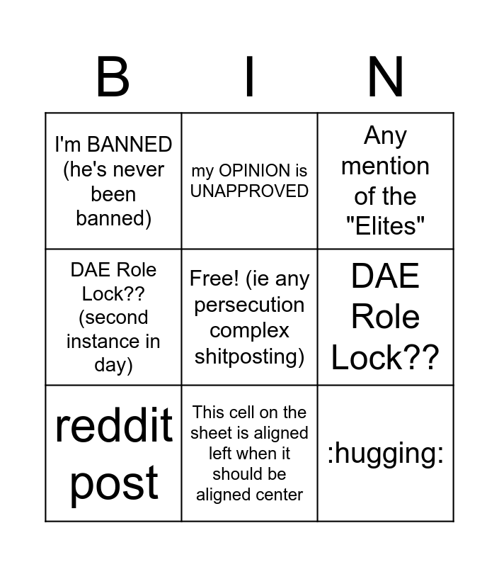 This bingo card has a free space and 8 words: DAE Role Lock??, Any mention of the "Elites", my OPINION is UNAPPROVED, reddit post, I'm BANNED (he's never been banned), :hugging:, DAE Role Lock?? (second instance in day) and This cell on the sheet is aligned left when it should be aligned center.
