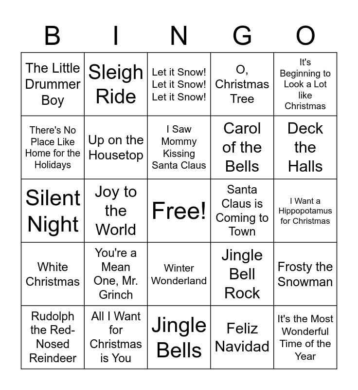 This bingo card has a free space and 24 words: You're a Mean One, Mr. Grinch, All I Want for Christmas is You, I Saw Mommy Kissing Santa Claus, Rudolph the Red-Nosed Reindeer, It's Beginning to Look a Lot like Christmas, The Little Drummer Boy, There's No Place Like Home for the Holidays, Sleigh Ride, Santa Claus is Coming to Town, Winter Wonderland, Carol of the Bells, Silent Night, Jingle Bell Rock, Frosty the Snowman, Up on the Housetop, Feliz Navidad, I Want a Hippopotamus for Christmas, Let it Snow! Let it Snow! Let it Snow!, Deck the Halls, Joy to the World, It's the Most Wonderful Time of the Year, White Christmas, O, Christmas Tree and Jingle Bells.