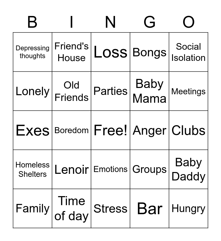 This bingo card has a free space and 40 words: Paranoia, Boredom, Depression, Anger, Frustration, Family, Old Friends, Other Users, Baby Mama, Baby Daddy, Exes, Friend's House, Bar, Clubs, Homeless Shelters, Lenoir, Basements, Bongs, Crack pipe, Depressing thoughts, Time of day, Parties, Groups, Meetings, Family gatherings, Money, Stress, Trauma, Self Medicating, Mental Illness, Anxiety, Loss, Chasing the High, Hungry, Lonely, Tired, Emotions, Physical Illness, Social Isolation and Reminiscing about the past.