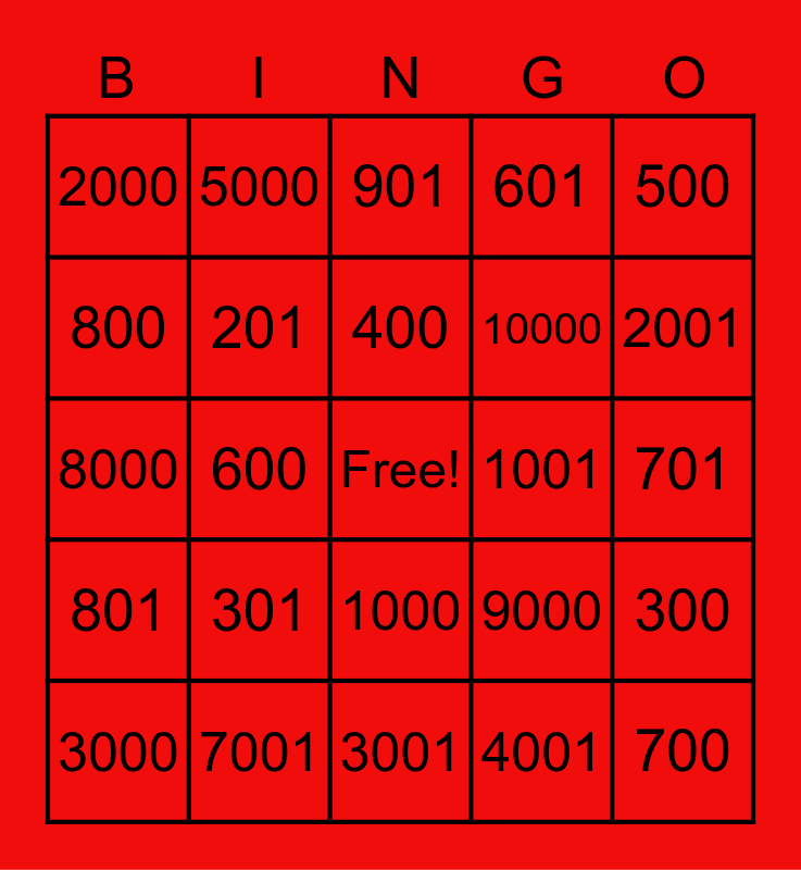 This bingo card has a free space and 37 words: 100, 101, 200, 201, 300, 301, 400, 401, 500, 501, 600, 601, 700, 701, 800, 801, 900, 901, 1000, 1001, 2000, 2001, 3000, 3001, 4000, 4001, 5000, 5001, 6000, 6001, 7000, 7001, 8000, 8001, 9000, 10000 and un millón.