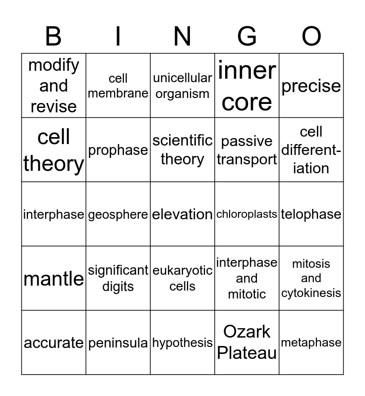 This bingo card has 25 words: significant digits, hypothesis, scientific theory, accurate, precise, modify and revise, cell theory, cell membrane, chloroplasts, eukaryotic cells, passive transport, interphase, interphase and mitotic, mitosis and cytokinesis, prophase, metaphase, telophase, unicellular organism, cell different-iation, geosphere, elevation, peninsula, mantle, inner core and Ozark Plateau.