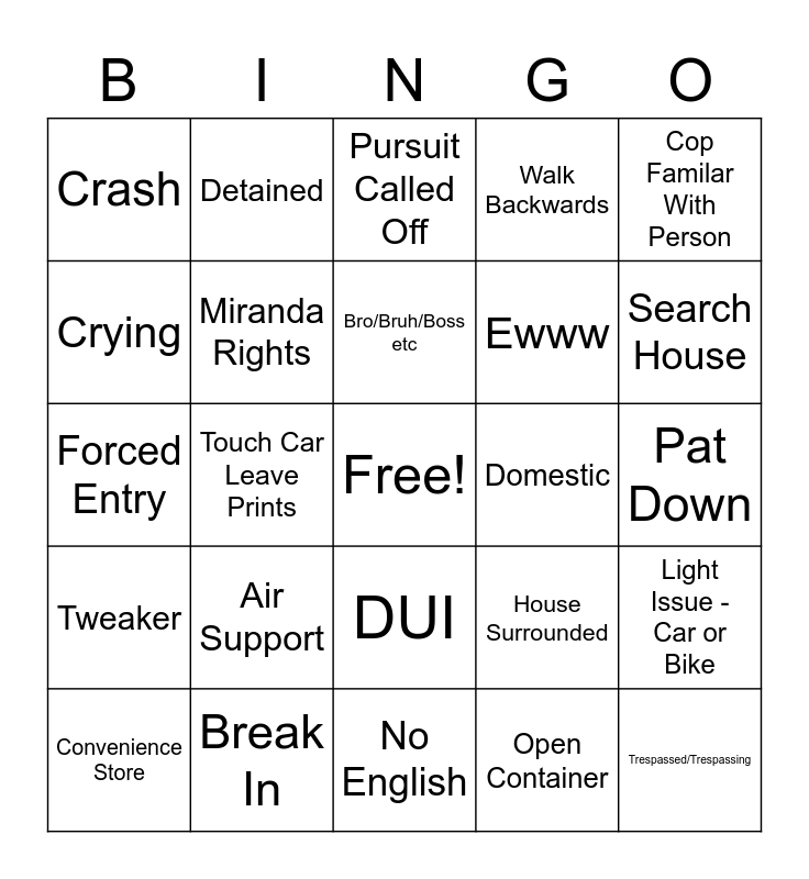 This bingo card has a free space and 24 words: Air Support, Break In, Bro/Bruh/Boss etc, Convenience Store, Cop Familar With Person, Crash, Crying, Detained, Domestic, DUI, Ewww, Forced Entry, House Surrounded, Light Issue - Car or Bike, Miranda Rights, Open Container, Pat Down, Pursuit Called Off, Search House, Touch Car Leave Prints, Trespassed/Trespassing, Tweaker, Walk Backwards and No English.