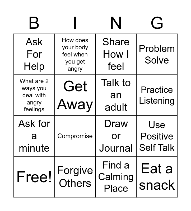 This bingo card has 16 words: Free!, Forgive Others, Share How I feel, Problem Solve, What are 2 ways you deal with angry feelings, How does your body feel when you get angry, Draw or Journal, Use Positive Self Talk, Ask For Help, Get Away, Find a Calming Place, Practice Listening, Ask for a minute, Compromise, Talk to an adult and Eat a snack.