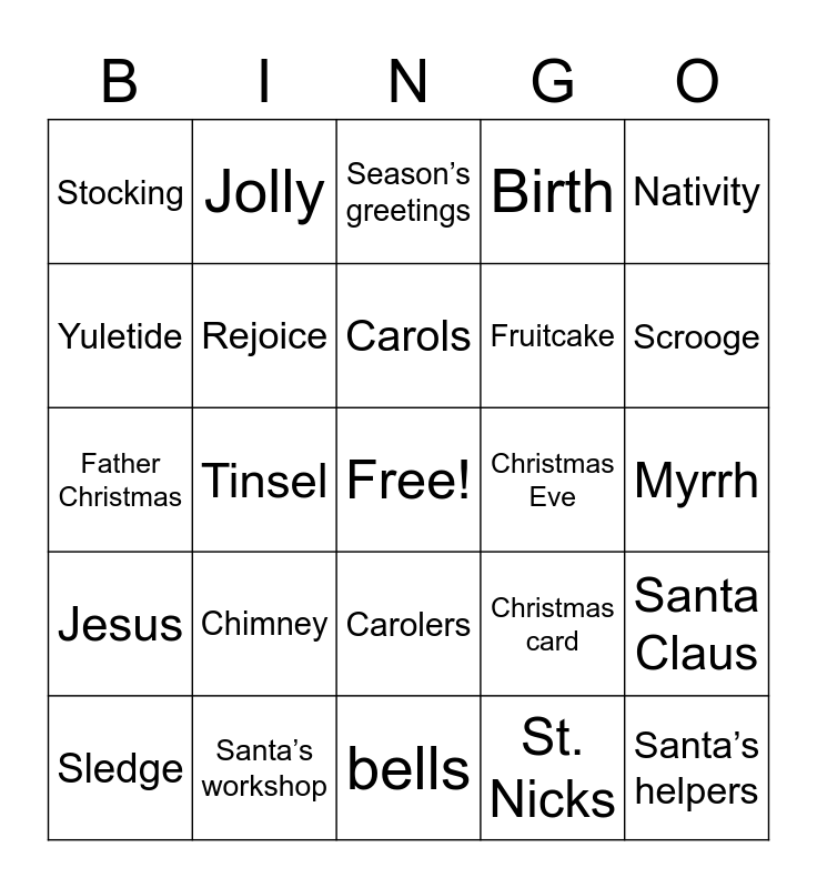 This bingo card has a free space and 63 words: Christmas, Merry, Festive, Santa Claus, Saint Nicholas, Elves, Jolly, Reindeer, Carols, Carolling, Carolers, Mistletoe, Myrrh, Nativity, Xmas, Yuletide, Tinsel, Stocking, Presents, Fruitcake, Chimney, Jesus, Birth, Family, Candy, Pinecone, Spirit, Tidings, Tradition, Rudolph, Sleigh, Holiday, Holly, Ornaments, Scrooge, Sledge, Snowball, St. Nicks, Snowman, Rejoice, Father Christmas, Christmas Eve, Christmas tree, Jack Frost, Santa’s helpers, Santa’s workshop, Christmas carol, Christmas card, Frosty the Snowman, December 25, Sleigh, bells, Gingerbread house, North Pole, Plum pudding, Season’s greetings, Celebrate, Christmas tree, Chestnuts, Angel, Elf, Feast and Goose.