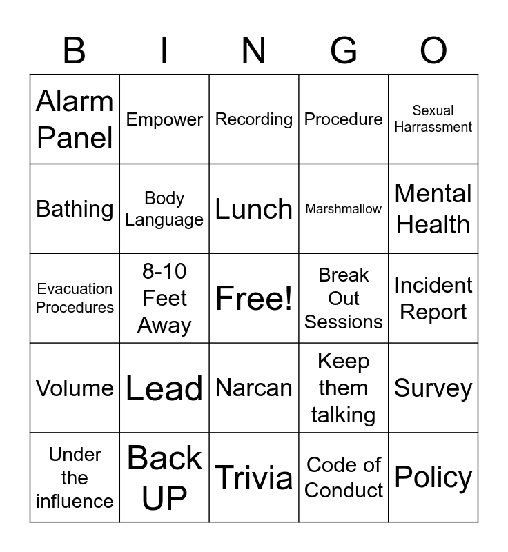 This bingo card has a free space and 24 words: Lead, Back UP, Lunch, Under the influence, Sexual Harrassment, Alarm Panel, Bathing, Empower, Break Out Sessions, Narcan, Marshmallow, Evacuation Procedures, Keep them talking, Survey, Body Language, Code of Conduct, Incident Report, Recording, Mental Health, 8-10 Feet Away, Policy, Volume, Procedure and Trivia.
