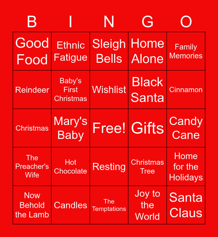 This bingo card has a free space and 24 words: Hot Chocolate, Candles, Wishlist, Now Behold the Lamb, Family Memories, Good Food, Reindeer, Ethnic Fatigue, Gifts, Resting, Black Santa, Christmas, Christmas Tree, Home for the Holidays, Baby's First Christmas, Joy to the World, Candy Cane, Sleigh Bells, Cinnamon, Mary's Baby, Santa Claus, The Preacher's Wife, Home Alone and The Temptations.