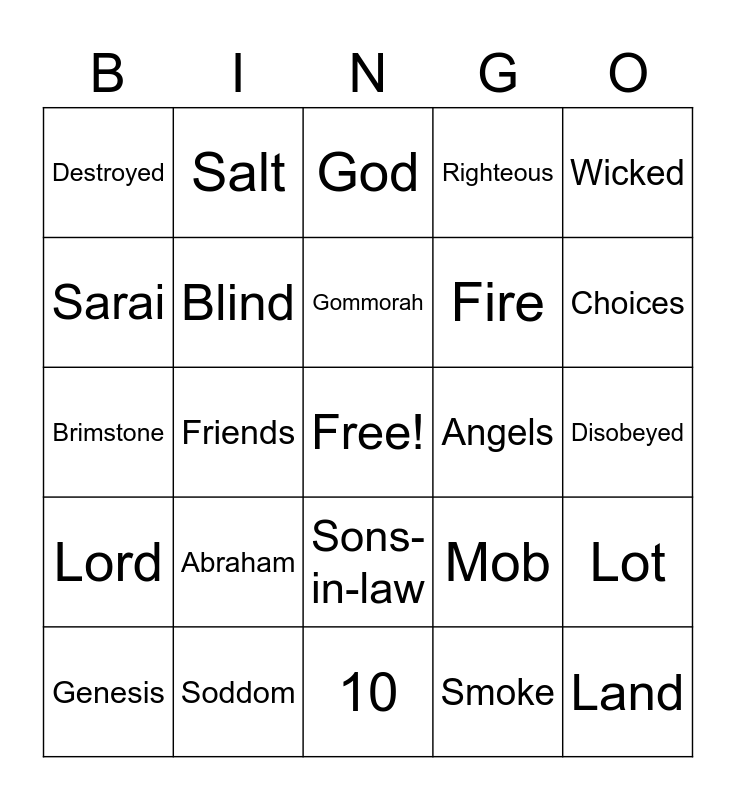 This bingo card has a free space and 24 words: Abraham, Soddom, Gommorah, Genesis, Wicked, Destroyed, Sarai, Salt, Angels, Sons-in-law, Fire, Brimstone, Mob, Lot, Blind, Smoke, Disobeyed, God, Choices, Friends, Land, Lord, Righteous and 10.