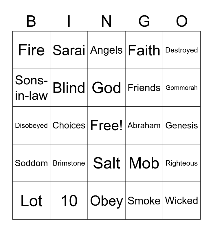 This bingo card has a free space and 24 words: Brimstone, 10, God, Lot, Destroyed, Fire, Sons-in-law, Sarai, Abraham, Salt, Friends, Disobeyed, Mob, Righteous, Blind, Smoke, Genesis, Angels, Gommorah, Choices, Wicked, Soddom, Faith and Obey.