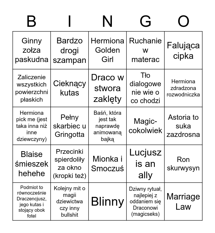This bingo card has a free space and 24 words: Przecinki spierdoliły za okno (kropki też), Kolejny mit o magii dziewictwa czy inny bullshit, Draco w stwora zaklęty, Podmiot to równocześnie Draczencjusz, jego kutas i stojący obok fotel, Falująca cipka, Ginny zołza paskudna, Zaliczenie wszystkich powierzchni płaskich, Bardzo drogi szampan, Magic-cokolwiek, Mionka i Smoczuś, Tło dialogowe nie wie o co chodzi, Hermiona pick me (jest taka inna niż inne dziewczyny), Lucjusz is an ally, Ron skurwysyn, Cieknący kutas, Dziwny rytuał, najlepiej z oddaniem się Draconowi (magicseks), Astoria to suka zazdrosna, Hermiona Golden Girl, Hermiona zdradzona rozwodniczka, Pełny skarbiec u Gringotta, Marriage Law, Blaise śmieszek hehehe, Ruchanie w materac and Blinny.