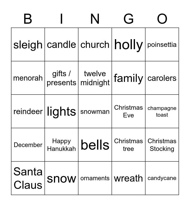 This bingo card has a free space and 29 words: Star, snow, church, Christmas cards, poinsettia, sleigh, gifts / presents, twelve midnight, Christmas Eve, Christmas Stocking, Santa Claus, lights, wreath, candycane, reindeer, decorated cookies, ornaments, Christmas tree, carolers, December, Happy Hanukkah, New Years Eve, family, champagne toast, menorah, candle, bells, holly and peace.
