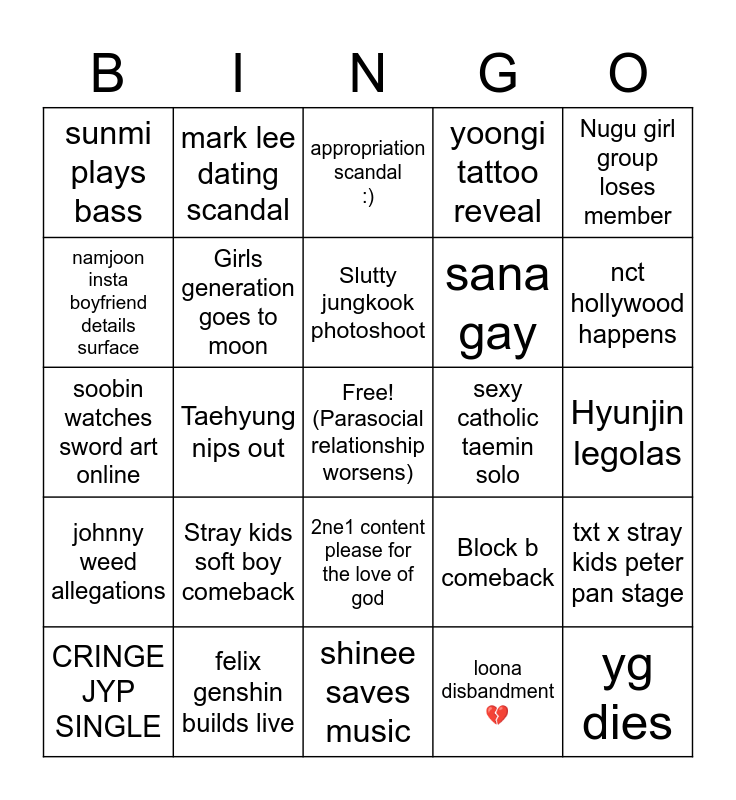 This bingo card has a free space and 24 words: CRINGE JYP SINGLE, Stray kids soft boy comeback, Slutty jungkook photoshoot, loona disbandment 💔, Nugu girl group loses member, sunmi plays bass, mark lee dating scandal, appropriation scandal :), sexy catholic taemin solo, Hyunjin legolas, soobin watches sword art online, Girls generation goes to moon, Block b comeback, txt x stray kids peter pan stage, namjoon insta boyfriend details surface, felix genshin builds live, shinee saves music, yoongi tattoo reveal, nct hollywood happens, johnny weed allegations, Taehyung nips out, 2ne1 content please for the love of god, sana gay and yg dies.