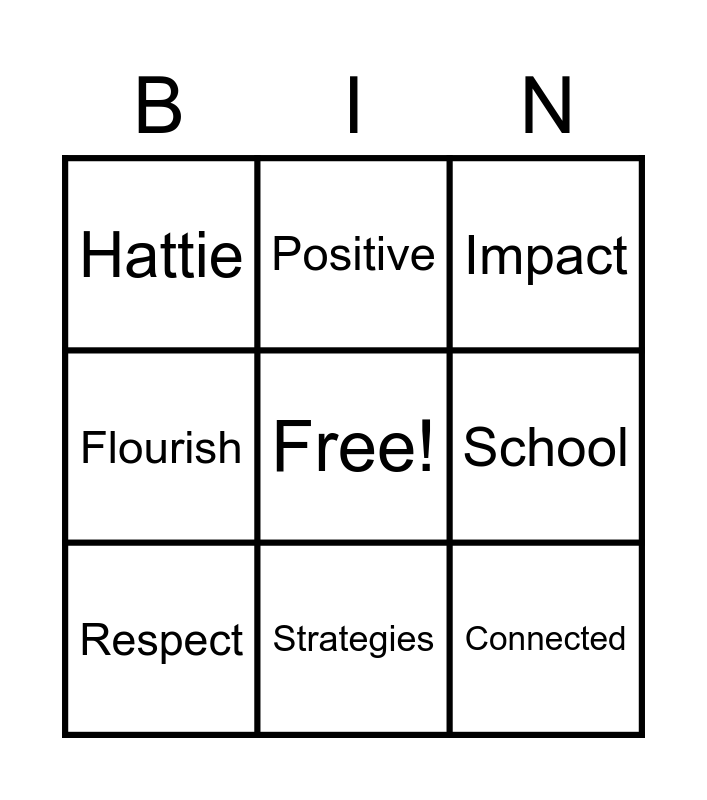 This bingo card has a free space and 20 words: Relationship, Teacher, Impact, Achievement, Student, Connected, Research, Hattie, Effect Size, Positive, Respect, Collective Teacher Efficacy, School, Social Emotional Learning (SEL), Respect, Classrooms, Strategies, Flourish, Learning and Teach.