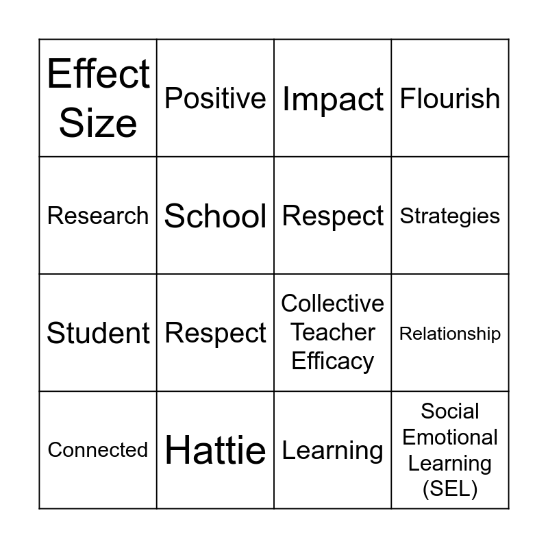 This bingo card has 20 words: Relationship, Teacher, Impact, Achievement, Connected, Research, Hattie, Effect Size, Student, Positive, Respect, Collective Teacher Efficacy, School, Social Emotional Learning (SEL), Respect, Classrooms, Strategies, Flourish, Learning and Teach.