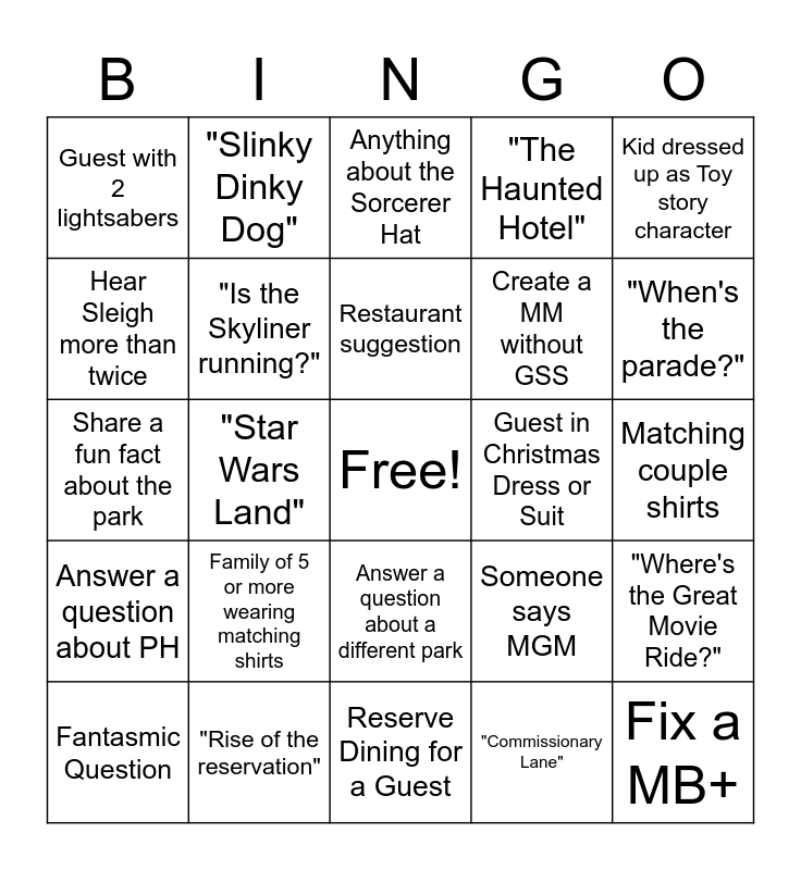 This bingo card has a free space and 24 words: Family of 5 or more wearing matching shirts, "Rise of the reservation", Restaurant suggestion, Fantasmic Question, Kid dressed up as Toy story character, Guest with 2 lightsabers, Hear Sleigh more than twice, "Slinky Dinky Dog", Guest in Christmas Dress or Suit, Answer a question about a different park, Create a MM without GSS, Share a fun fact about the park, Someone says MGM, "Where's the Great Movie Ride?", "Is the Skyliner running?", "Commissionary Lane", Matching couple shirts, Anything about the Sorcerer Hat, "When's the parade?", "Star Wars Land", Fix a MB+, Answer a question about PH, "The Haunted Hotel" and Reserve Dining for a Guest.