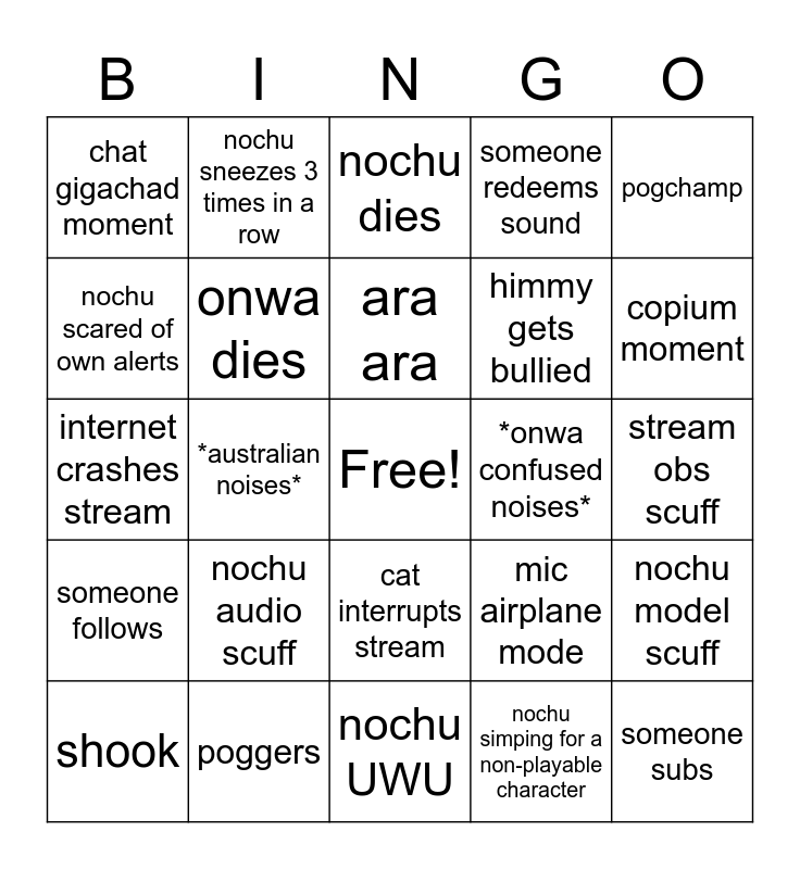 This bingo card has a free space and 24 words: nochu audio scuff, poggers, ara ara, shook, pogchamp, chat gigachad moment, nochu scared of own alerts, nochu sneezes 3 times in a row, *onwa confused noises*, cat interrupts stream, himmy gets bullied, internet crashes stream, mic airplane mode, nochu model scuff, onwa dies, nochu simping for a non-playable character, stream obs scuff, nochu dies, copium moment, *australian noises*, someone subs, someone follows, someone redeems sound and nochu UWU.