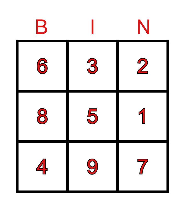 This bingo card has a free space and 8 words: 1, 2, 3, 4, 6, 7, 8 and 9.