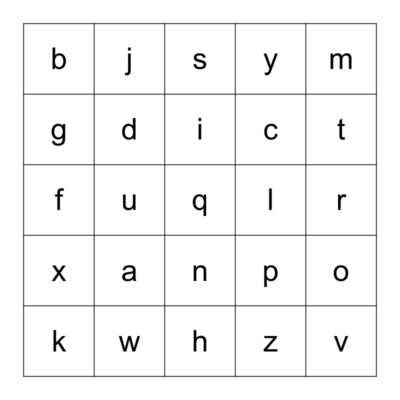 This bingo card has a free space and 25 words: a, h, i, k, m, b, g, j, l, n, c, f, p, o, d, e, r, s, t, u, v, w, x, y and z.