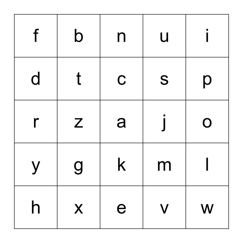This bingo card has a free space and 25 words: g, e, c, h, i, f, d, b, j, k, s, r, m, l, t, q, o, n, p, z, w, x, y, u and v.