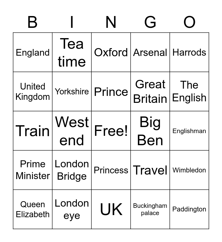 This bingo card has a free space and 24 words: London Bridge, London eye, Prince, Queen Elizabeth, Harrods, England, United Kingdom, Tea time, Big Ben, Princess, Great Britain, Train, Travel, Wimbledon, Yorkshire, Buckingham palace, Englishman, Oxford, The English, West end, Paddington, Prime Minister, Arsenal and UK.