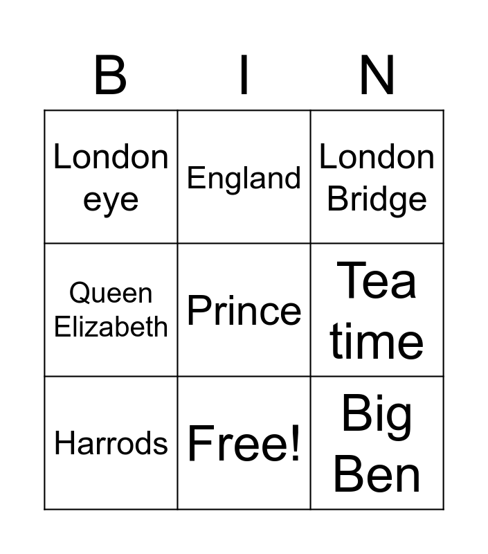 This bingo card has 10 words: Free!, London Bridge, London eye, Prince, Queen Elizabeth, Harrods, England, United Kingdom, Tea time and Big Ben.