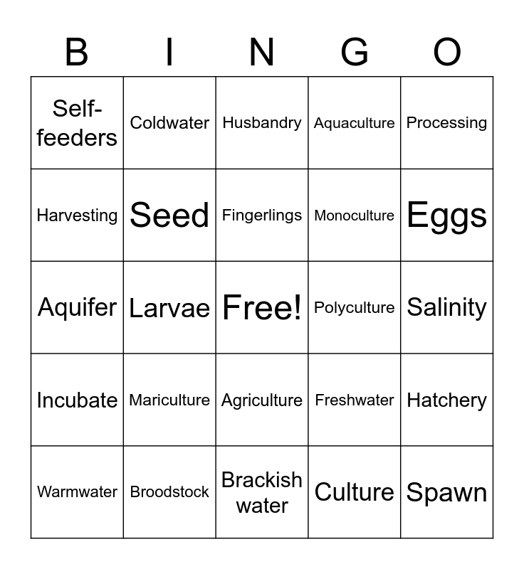 This bingo card has a free space and 25 words: Mariculture, Brackish water, Fingerlings, Warmwater, Processing, Self-feeders, Harvesting, Coldwater, Polyculture, Agriculture, Monoculture, Aquifer, Freshwater, Hatchery, Seed, Grow-out, Salinity, Husbandry, Eggs, Larvae, Spawn, Broodstock, Incubate, Aquaculture and Culture.