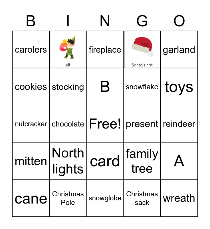 This bingo card has 2 images, a free space and 27 words: cane, bell, chocolate, gingerbread, carolers, fireplace, stocking, North lights, present, Christmas Pole, reindeer, wreath, snowglobe, Christmas sack, toys, chimney, card, mitten, garland, nutcracker, family tree, mistletoe, snowflake, cookies, A, B and C.