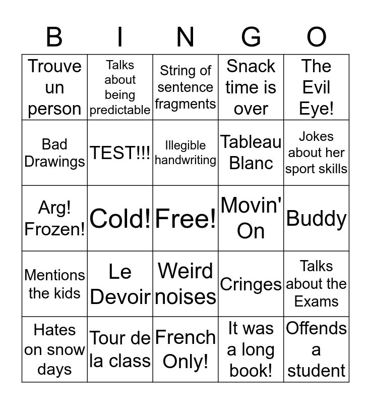 This bingo card has a free space and 24 words: Le Devoir, Tour de la class, Illegible handwriting, Hates on snow days, The Evil Eye!, Trouve un person, Bad Drawings, Talks about being predictable, Movin' On, Weird noises, Tableau Blanc, Arg! Frozen!, Cringes, Talks about the Exams, TEST!!!, It was a long book!, Buddy, String of sentence fragments, Jokes about her sport skills, Cold!, Offends a student, Mentions the kids, Snack time is over and French Only!.