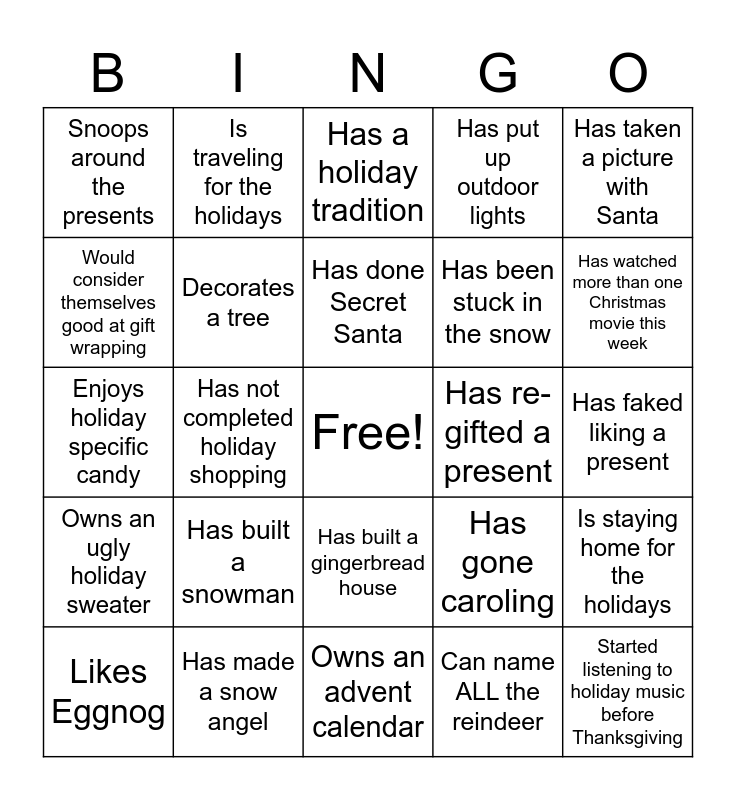 This bingo card has a free space and 29 words: Likes Eggnog, Sent out a holiday card this year, Has not completed holiday shopping, Tried pulling Santa's beard as a child, Snoops around the presents, Has a holiday tradition, Decorates a tree, Has built a snowman, Has re-gifted a present, Has made a snow angel, Has faked liking a present, Started listening to holiday music before Thanksgiving, Owns an advent calendar, Can name ALL the reindeer, Has watched more than one Christmas movie this week, Bakes cookies during the holiday's, Has built a gingerbread house, Owns an ugly holiday sweater, Has taken a picture with Santa, Enjoys holiday specific candy, Has gone caroling, Wears holiday PJs, Has been stuck in the snow, Would consider themselves good at gift wrapping, Has put up outdoor lights, Is traveling for the holidays, Is staying home for the holidays, Has done Secret Santa and Has been sledding.