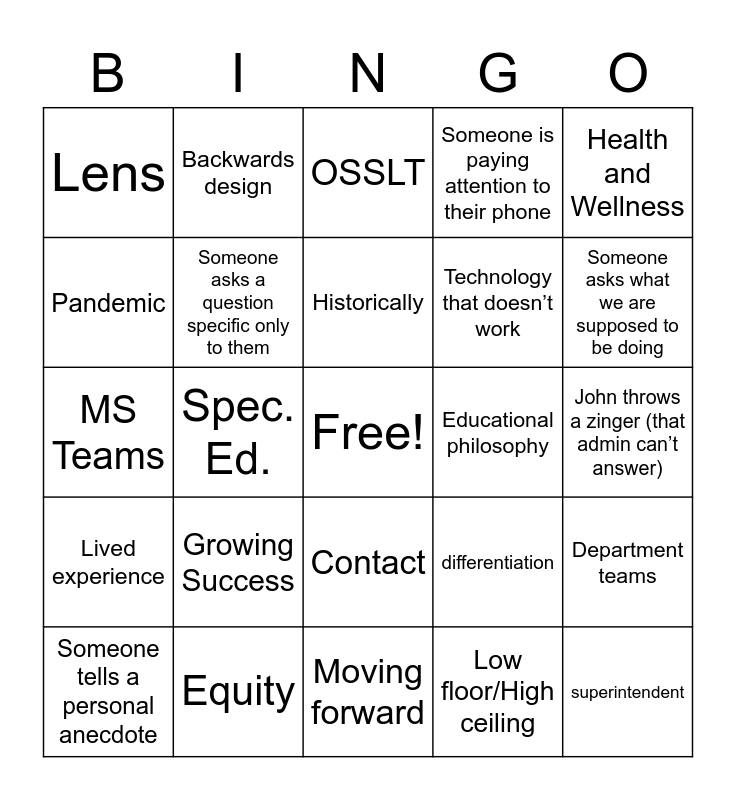 This bingo card has a free space and 48 words: exit card, superintendent, Learning for All, Moving forward, Growing Success, Learner Profile, Backwards design, someone arrives over 15 minutes late, Pandemic, Masks, Someone asks a question specific only to them, Someone is paying attention to their phone, Department teams, differentiation, UDL, the final 30, Historically, Educational philosophy, Literacy, Health and Wellness, Spec. Ed., Low floor/High ceiling, Lens, Technology that doesn’t work, Consultant, Someone asks what we are supposed to be doing, Someone tells a personal anecdote, Can do, Contact, Lived experience, Assistive Technology, On the horizon, Emotion coaching, Validation, Equity, CCRP, Dig deeper, John throws a zinger (that admin can’t answer), Someone’s phone rings, The discussion goes down a rabbit hole, Elbow partner, Park it, OSSLT, HUB, MS Teams, Sharepoint, Case study and Christmas.